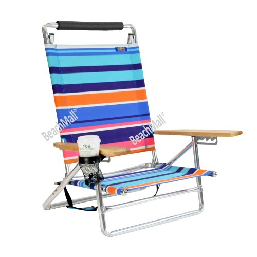 This folding beach chair is lightweight and compact folding making it easy transport and storage. Reclines to 5 positions, including a lay flat reclinig position for tanning at the beach * Seat Height of 8 inches from ground and overall height of 33 inches * Folded Dimensions (inches) 31L x 26W x 3.5H * Weighs 7 lbs and 250 lbs weight capacity * Integrated towel holder on the rear of seat of this folding beach chair
